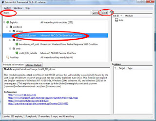 Kemudian pada kotak search ketikan dcom, lalu klik Find, dan pilihlah Exploits Microsoft RPC DCOM Interface Overflow.